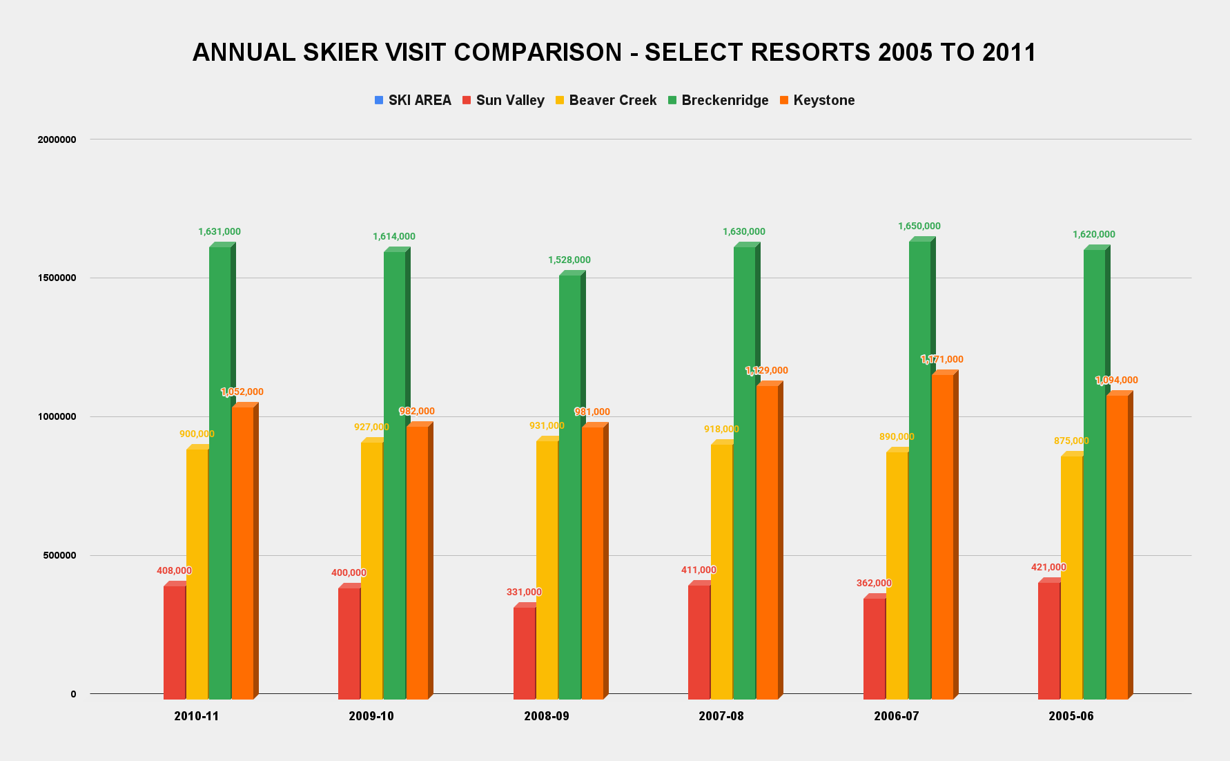 However, I can offer a limited historical view into the crowding advantages that Sun Valley offers in comparison to its easier-to-access peer resorts. Check out Sun Valley’s average annual skier visits from 2005 to 2011, compared to similarly sized Breckenridge and Keystone, and smaller Beaver Creek: