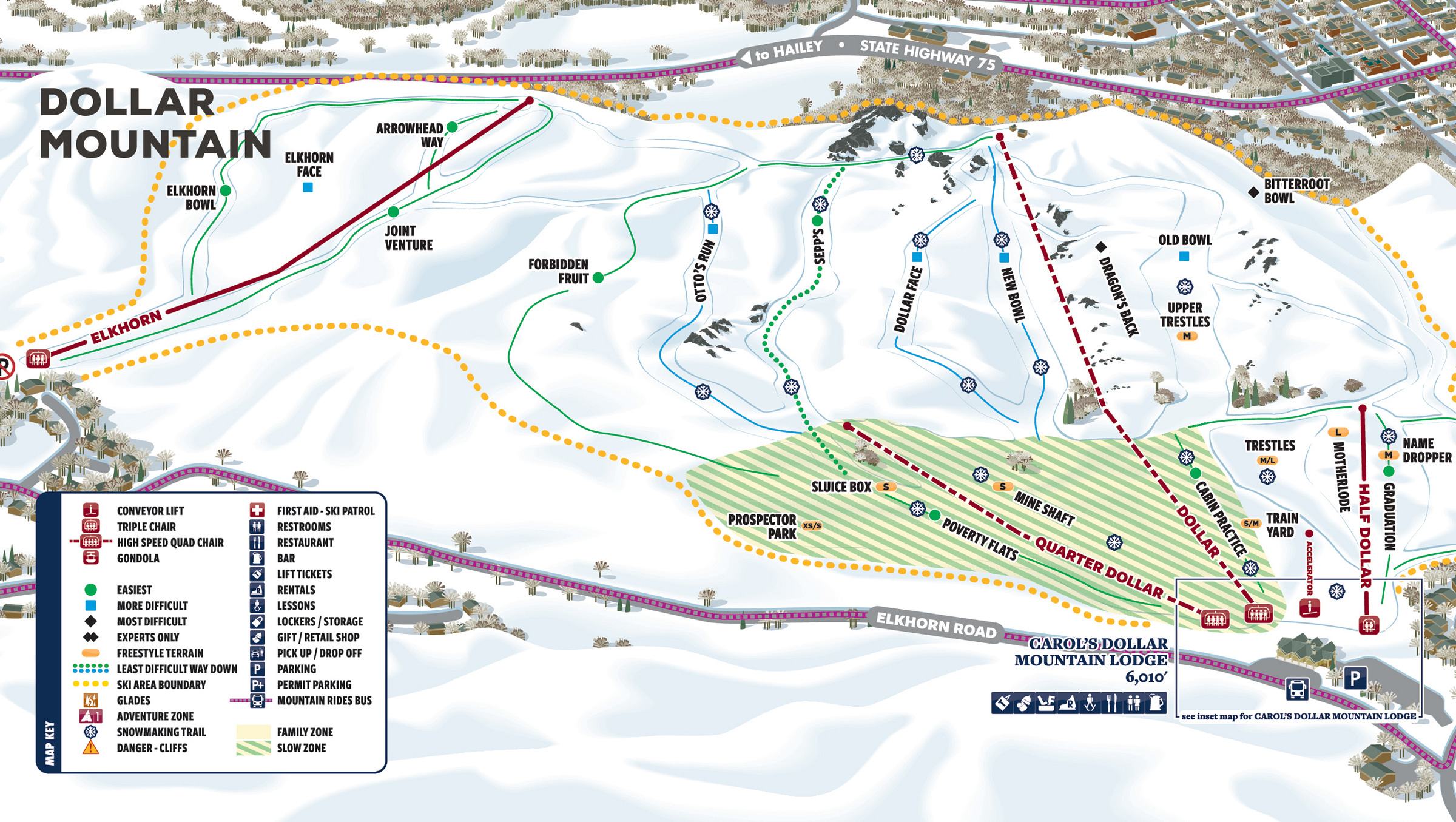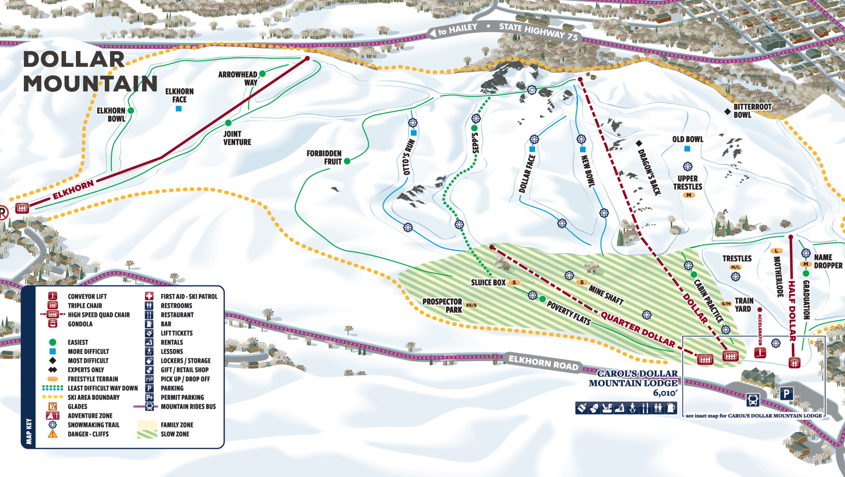 Dollar Mountain: 5 lifts (2 high-speed quads, 1 triple, 1 double, 1 carpet - view Lift Blog’s of inventory of Dollar Mountain’s lift fleet)