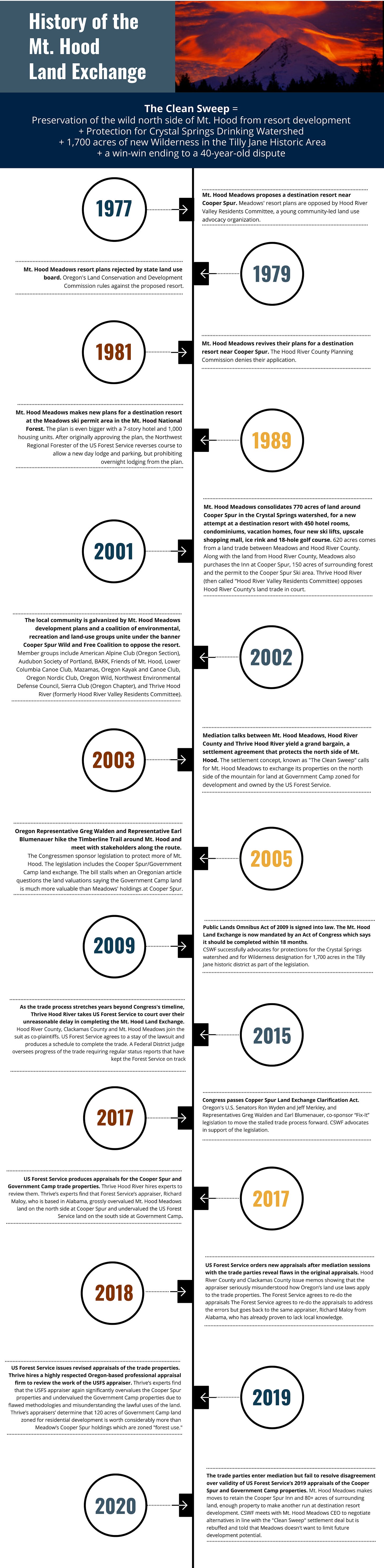 Here’s a somewhat-dated and very biased-against-the-ski-area infographic summarizing the proposed land swap between Meadows and the U.S. Forest Service, from the Cooper Spur Wild & Free Coalition, an organization that “first came together in 2002 to fight Mt. Hood Meadows’ plans to develop a sprawling destination resort on the slopes of Mt. Hood near Cooper Spur”: