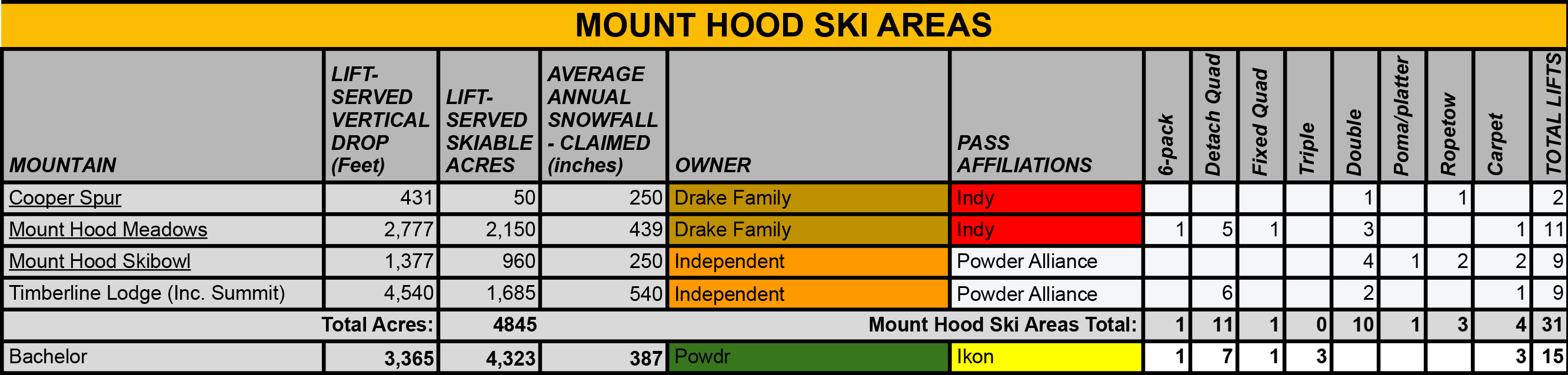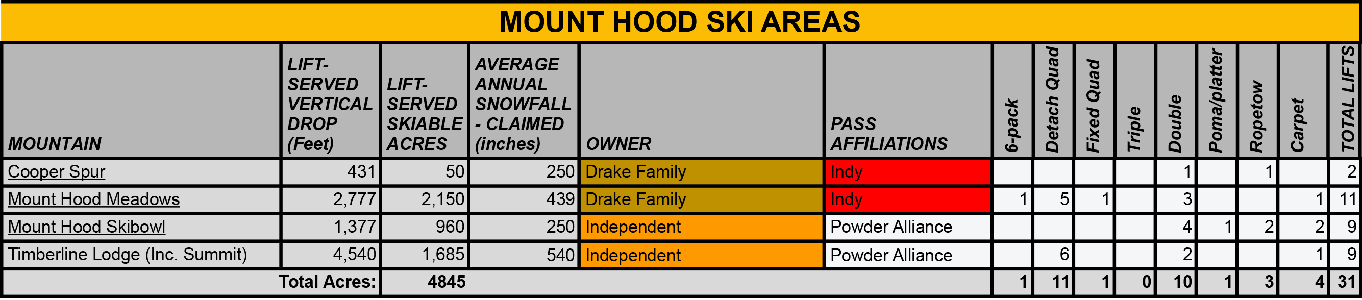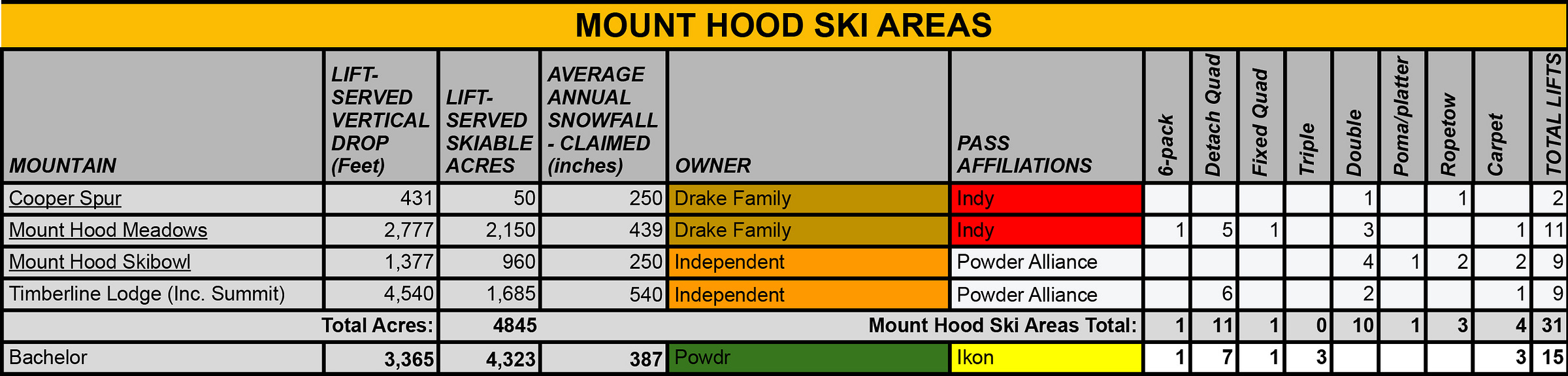 It’s interesting that the 4,845 combined skiable acres of Hood’s four ski areas are just a touch larger than the 4,323 acres at Mt. Bachelor, which as far as I know has operated as a single interconnected facility since its 1958 founding. Both are volcanoes whose ski areas operate on U.S. Forest Service land a commutable distance from demographically similar markets, providing a case study in distributed versus centralized management.