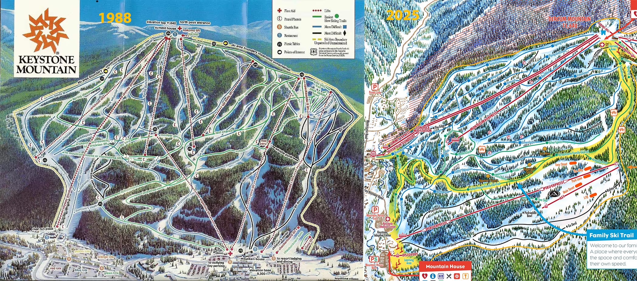 It’s kind of amazing that Keystone, which now spins seven high-speed chairlifts, didn’t install its first detachable until 1990, nearly a decade after neighboring Breckenridge installed the world’s first, in 1981. As with many resorts that have aggressively modernized, this means that Keystone once ran more chairlifts than it does today. When Pack started his ski career at the mountain in 1989, Keystone ran 10 frontside aerial lifts (8 doubles, 1 triple, 1 gondola) compared to just six today (2 doubles, 2 sixers, a high-speed quad, and a higher-capacity gondy).