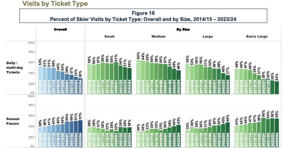 The rise of Epic and Ikon has correlated directly with a decrease in lift ticket visits and an increase in season pass visits. Per Kotke’s End-of-Season Demographic Report for 2023-24: