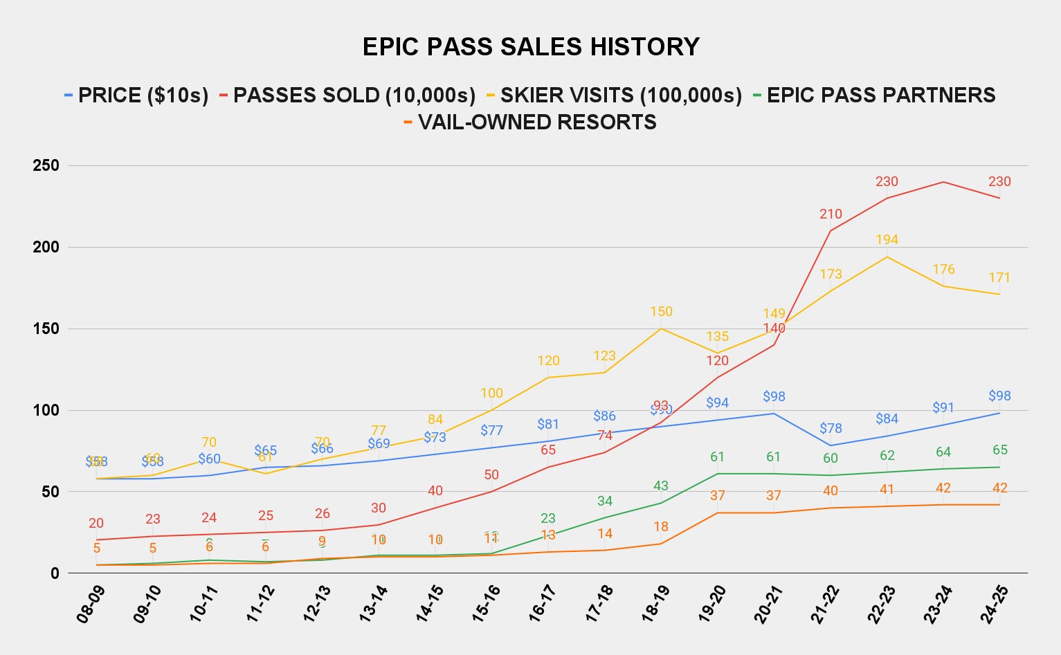 I said that the Epic Pass now offered access to “64 or 65” ski areas, but I neglected to include the six new ski areas that Vail partnered with in Austria for the 2025-26 ski season. The correct number of current Epic Pass partners is 71 (see chart above).
