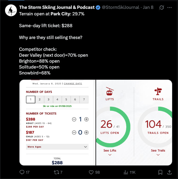 I claimed that Park City Mountain Resort was charging $328 for a holiday week lift ticket when it was “30 percent-ish open” and “the surrounding resorts were 70-ish percent open.” Unfortunately, I was way off on the dollar amount and the timeframe, as I was thinking of this X post I made on Wednesday, Jan. 8, when day-of tickets were selling for $288: