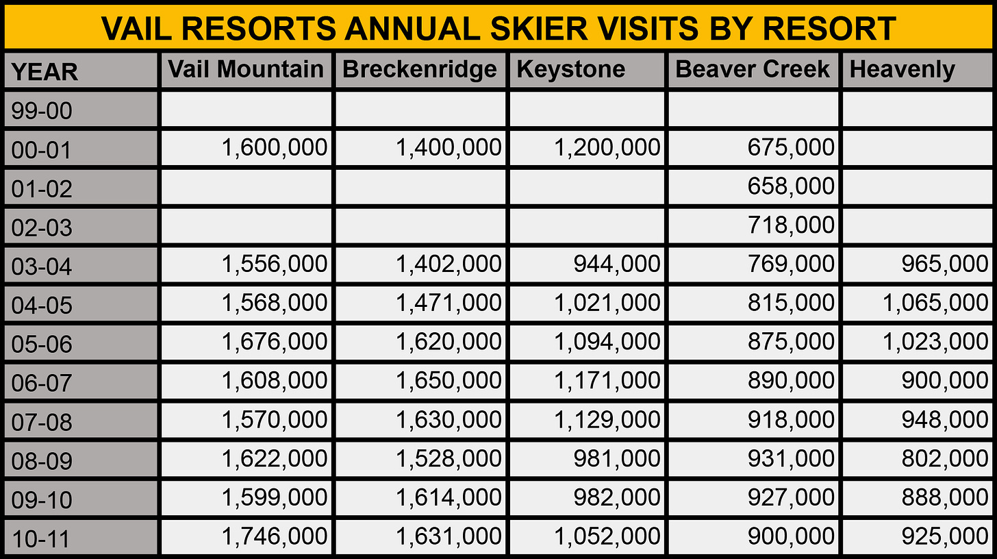 I jokingly ask Katz for resort-by-resort skier visits in passing. Here’s what I meant by that - up until the 2010-11 ski season, Vail, like all operators on U.S. Forest Service land, reported annual skier visits per ski area: