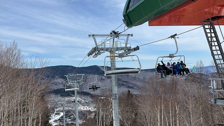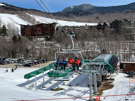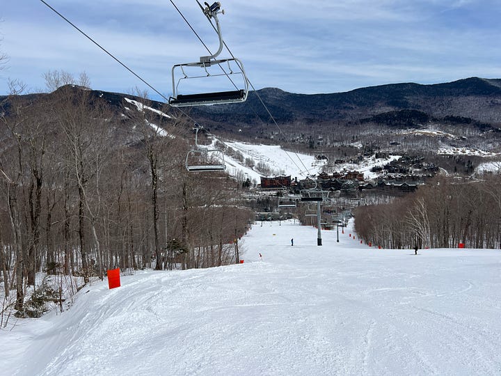 In 2022, Stowe replaced the Mountain triple chair, which sat up a flight of steep steps from the parking lot, with the at-grade Sunrise six-pack. It was the kind of big-time lift upgrade that transforms the experience of an entire ski area for everyone, whether they use the new lift or not, by pulling skiers toward a huge pod of underutilized terrain and away from longtime alpha lifts Fourrunner and the Mansfield Gondola.