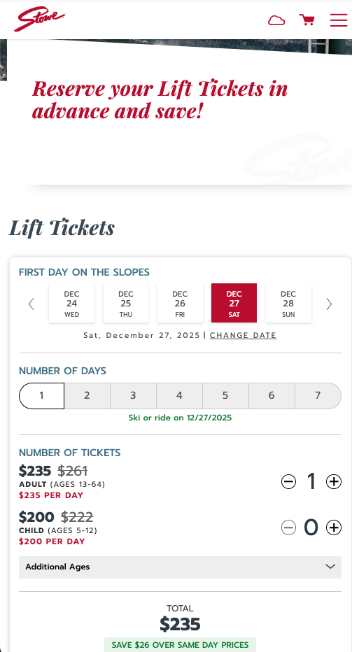 I claimed that Stowe’s top lift ticket price would drop from $239 last year to $235 this coming season, but that’s inaccurate. Upon further review, the peak walk-up rate appears to be increasing to $261 this coming winter: