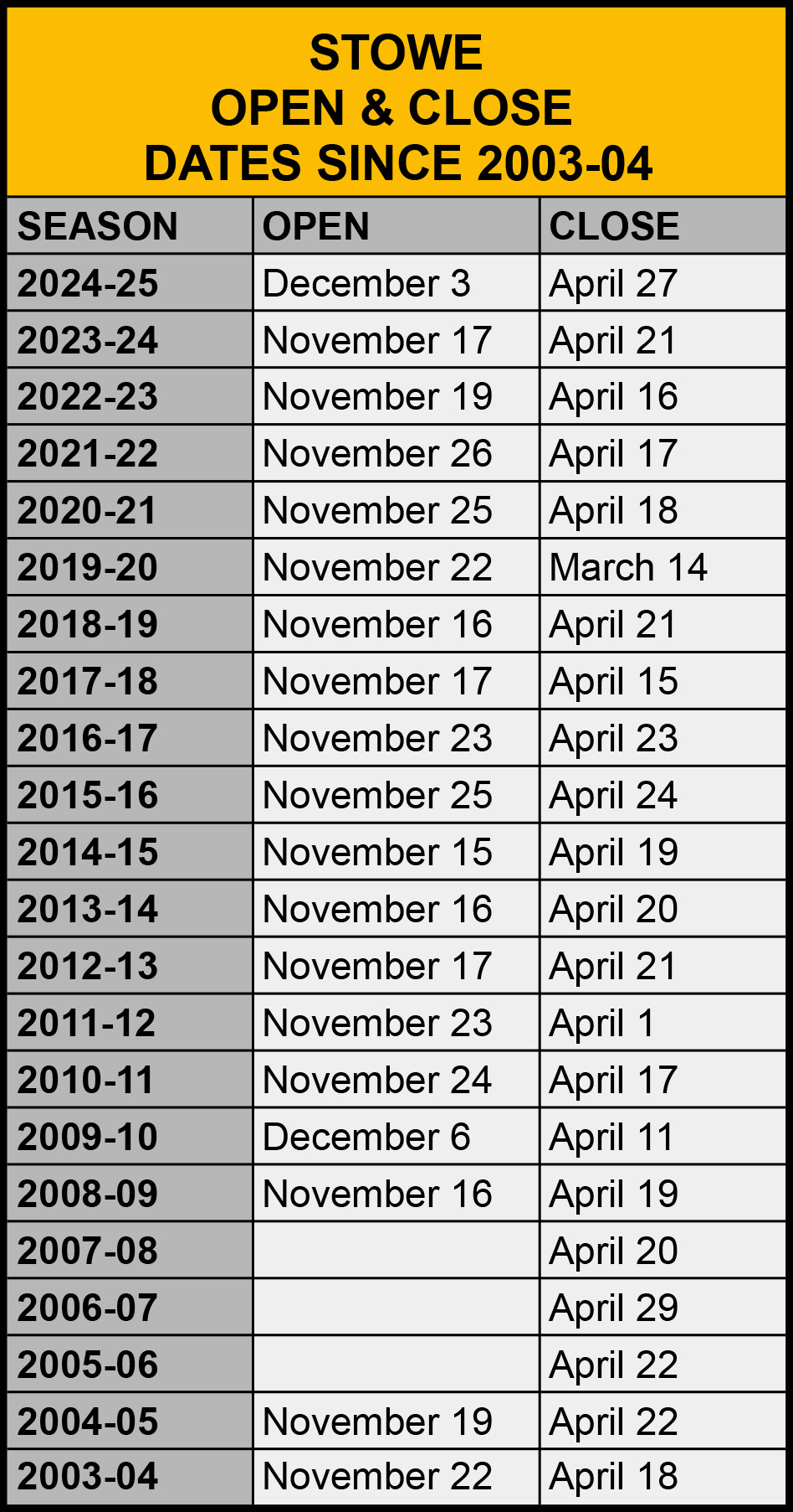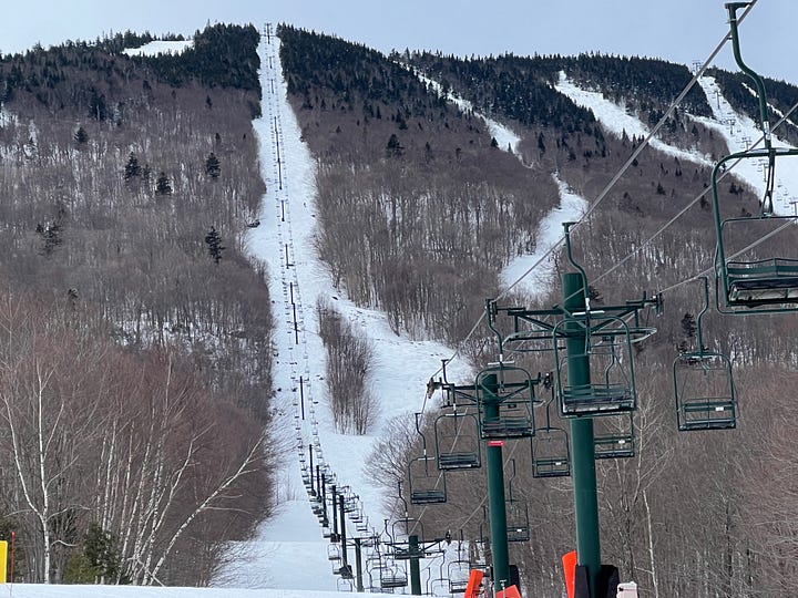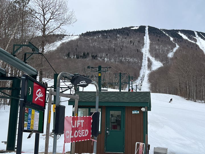 I intimated that Stowe had always closed the third weekend in April. That appears to be mostly true for the past two-ish decades, which is as far back as New England Ski History has records. The mountain did push late once, however, in 2007, and closed early during the horrible no-snow winter of 2011-12 (April 1), and the Covid-is-here-to-kill-us-all shutdown of 2020 (March 14).