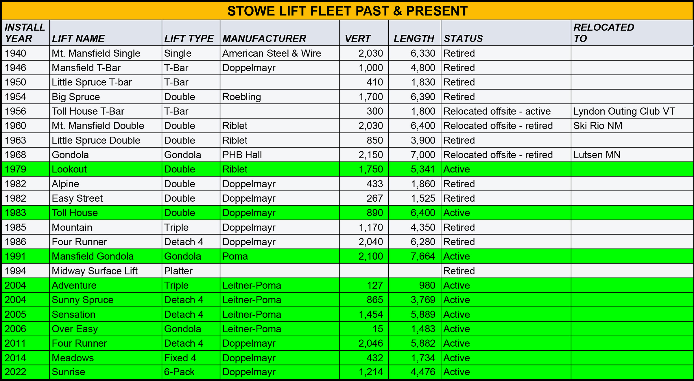 I said that the lifts at Stowe sometimes opened at “7:00 or 7:30,” but the earliest ski lift currently opens at 8:00 most mornings (the Over Easy transit gondola opens at 7:30). The Fourrunner quad used to open at 7:30 a.m. on weekends and holidays. I’m not sure when mountain ops changed that. Here’s the lift schedule clipped from the circa 2018 trailmap: