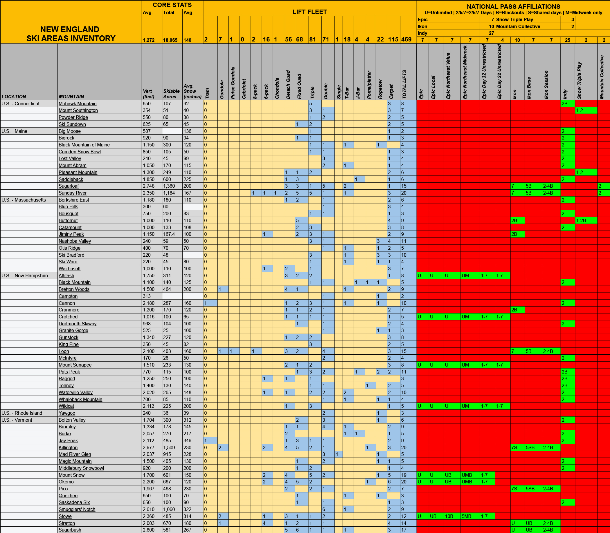 While Stowe doesn’t stand out in any one particular statistical category, the whole of the place stacks up really well to the rest of New England - here’s a breakdown of the 63 public ski areas that spin chairlifts across the six-state region: