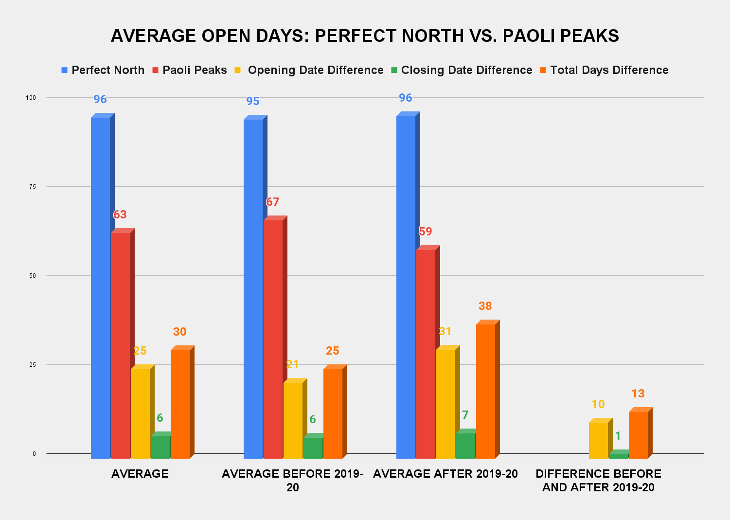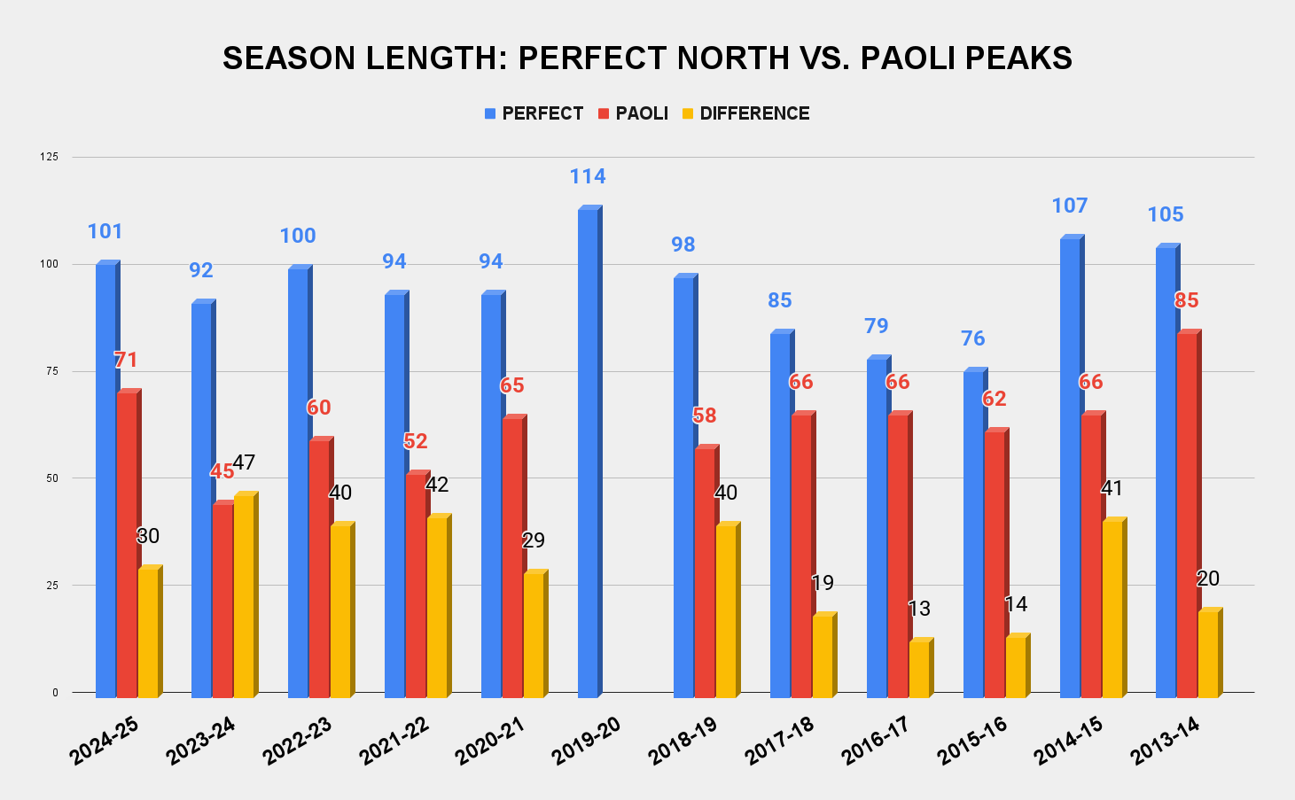 So yes, Perfect has always been a better operation than Paoli. But check this out: Paoli’s performance as compared to Perfect’s has been considerably worse in the five full seasons of Vail Resorts’ ownership (excluding 2019-20), than in the six seasons before, with Perfect besting Paoli to open by an average of 21 days before Vail arrived, and by 31 days after. Perfect’s seasons lasted an average of 25 days longer than Paoli’s before Vail arrived, and 38 days longer after: