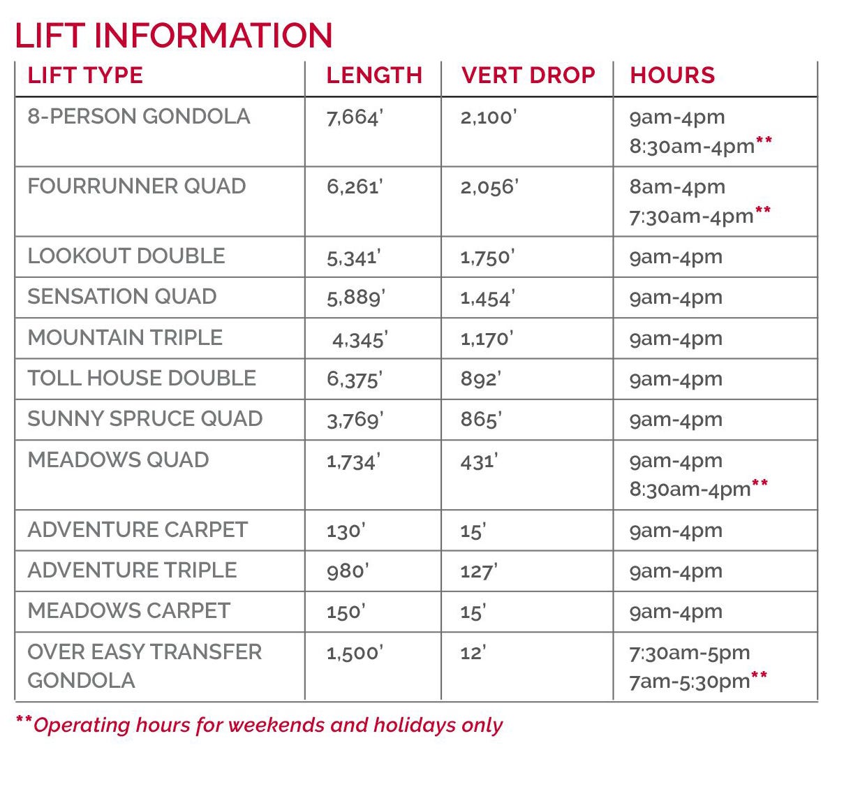 Lift count: 12 (1 eight-passenger gondola, 1 six-passenger gondola, 1 six-pack, 3 high-speed quads, 1 fixed-grip quad, 1 triple, 2 doubles, 2 carpets)