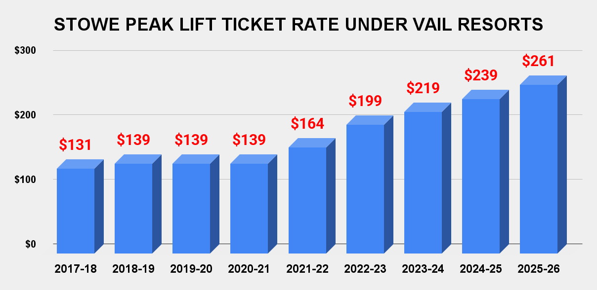 Which means Vail’s record of cranking Stowe lift ticket rates up remains consistent: