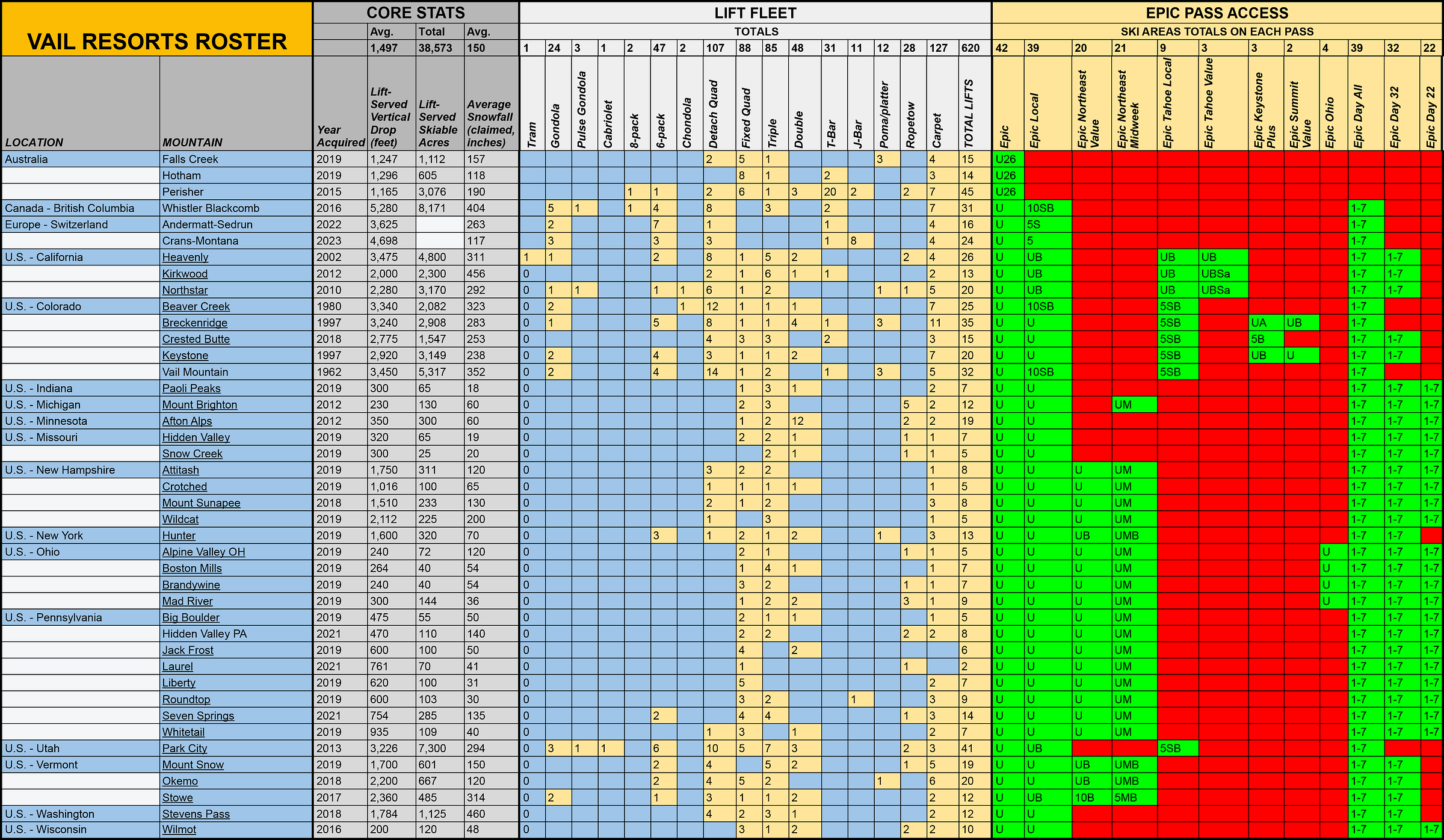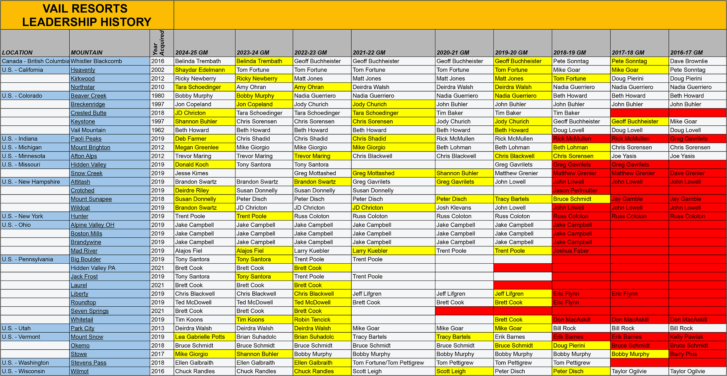 I may be overthinking this, but check this out: between 2017 and 2024, Vail Resorts changed leadership at its North American ski areas more than 70 times - the yellow boxes below mark a new president-general-manager equivalent (red boxes indicate that Vail did not yet own the ski area):