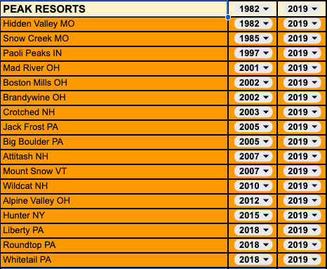 Vail purchased all of Peak Resorts, including Mount Snow, where Giorgio worked, in 2019. Here’s that company’s growth timeline: