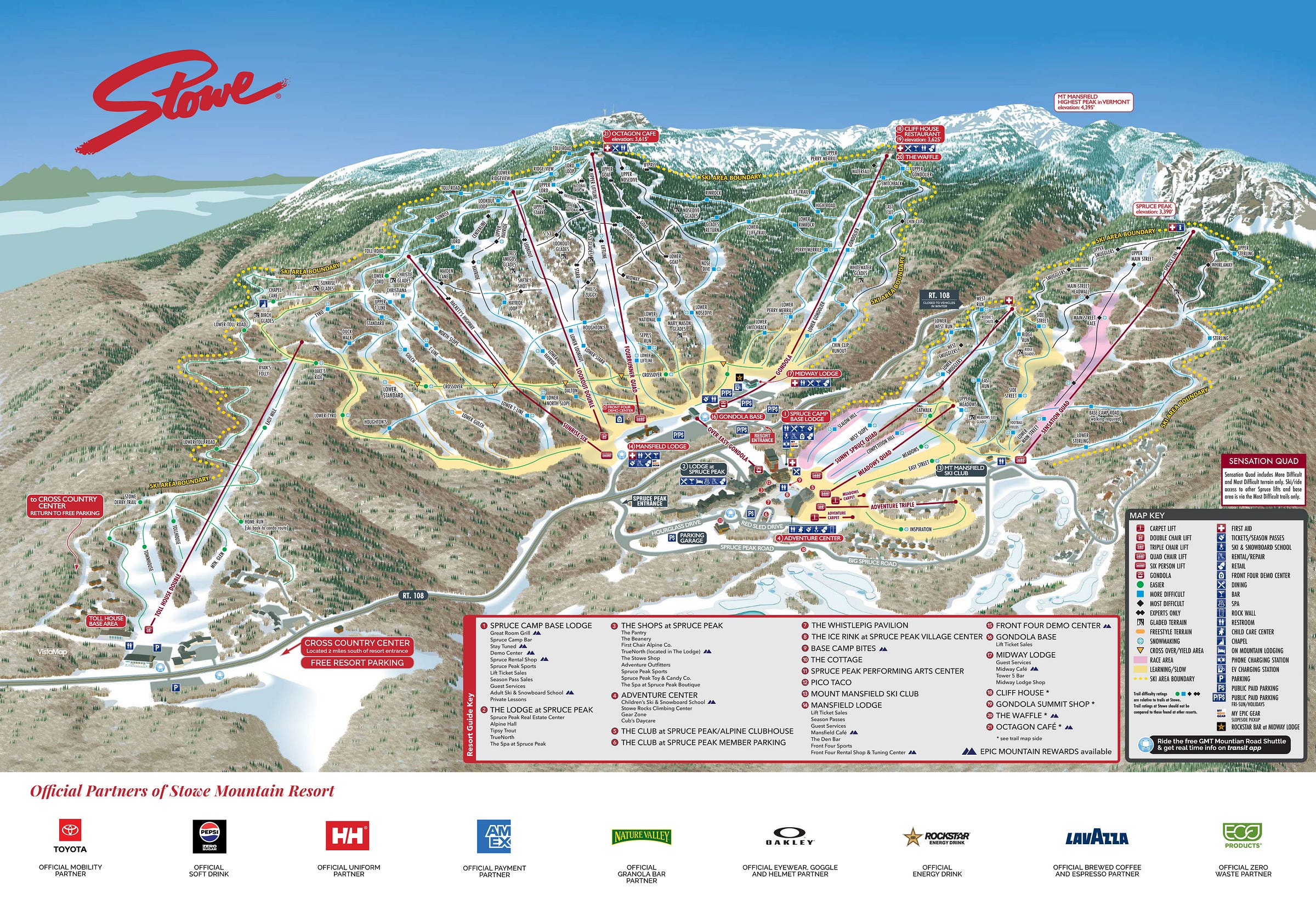 Summit elevation: 3,625 feet (top of the gondola), 4,395 feet at top of Mt. Mansfield