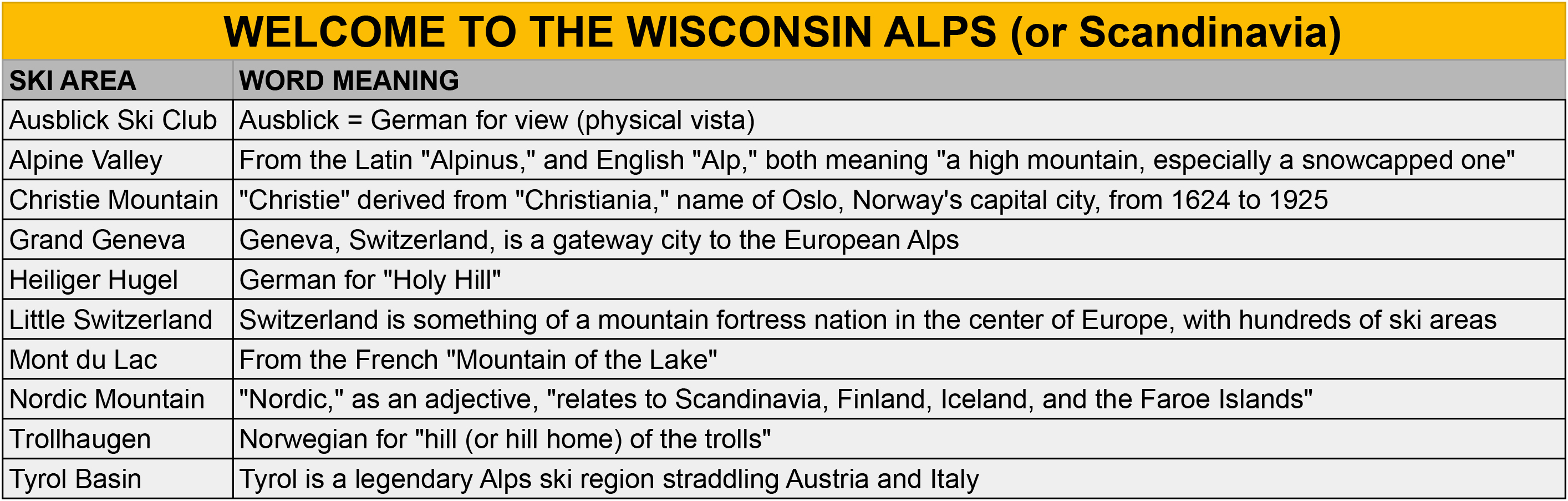 But one global immigration funnel dominated what became the modern Midwest: 50 percent of Wisconsin’s population descends from German, Nordic, or Scandinavian countries, who arrived in waves from the Colonial era through the early 1900s. The surnames are everywhere: Schmitz and Meyer and Webber and Schultz and Olson and Hanson. But these Old-Worlders came a bit late to name the cities and towns. So they named what they built instead. And they built a lot of ski areas. Ten of Wisconsin’s 34 ski areas carry names evocative of Europe’s cold regions, Scandinavia and the Alps: