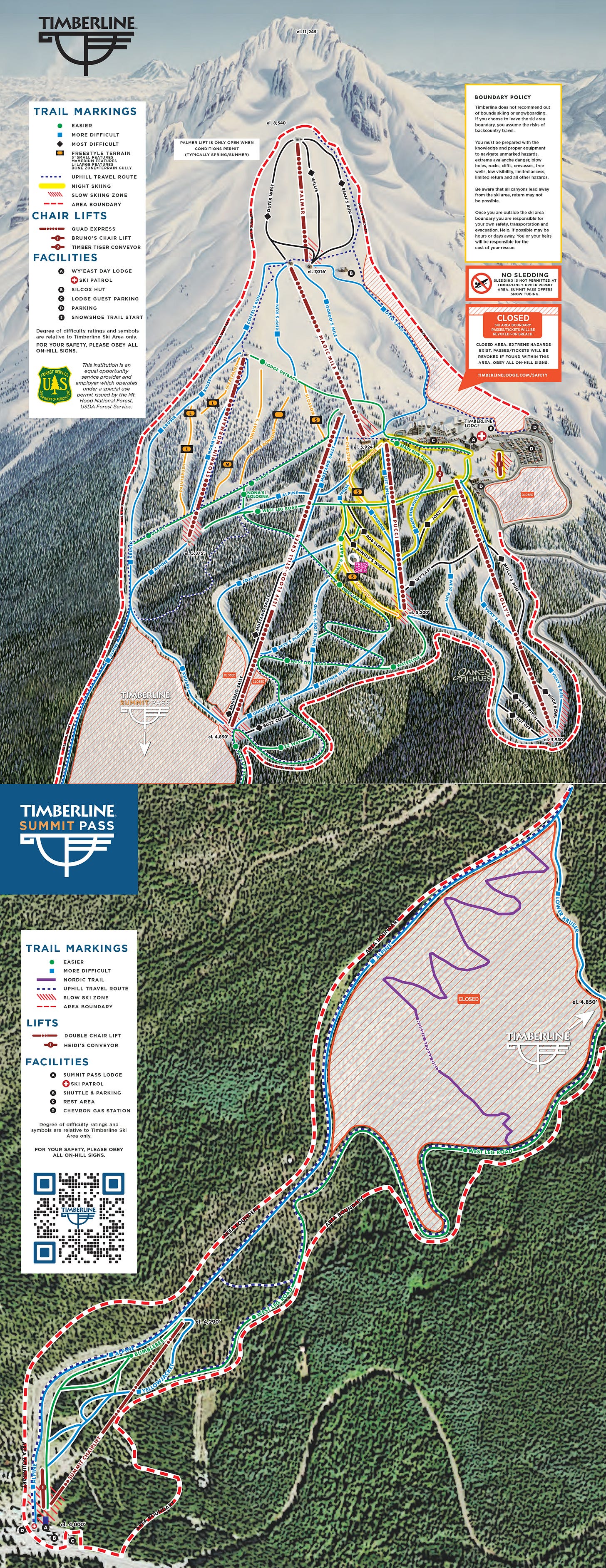 For now, skiers can ski all the way down, but have to ride back up to Timberline from the Summit base via shuttle. To further complicate the calculus here, the hyper-exposed Palmer high-speed summit quad rarely runs in winter, acting mostly as a summer workhorse for camp kids. When Palmer’s not running, a snowcat will sometimes shuttle skiers close to the unload point.