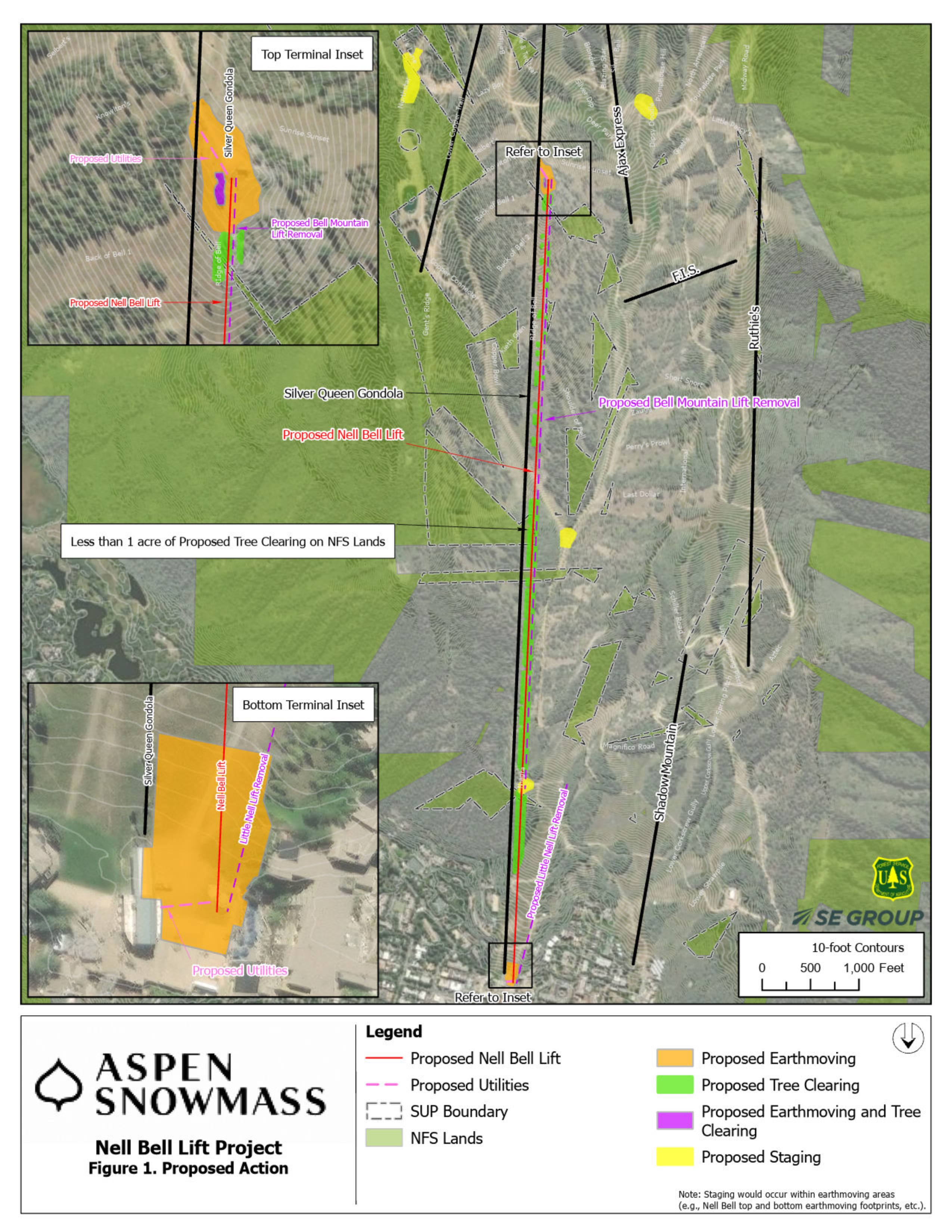 Oh man how freaking cool would it be to ride one chairlift from Aspen’s base to the top of Bell? Cross and I discuss Aspen Mountain’s Forest Service application to do exactly that, with a machine along roughly this line parallel to the gondola: