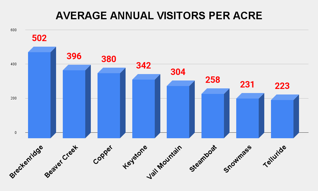 Snowmass’ 771,259 skier visits is still a lot of skier visits. But consider some additional stats: Snowmass is the third-largest ski area in Colorado and the 11th-largest in America. From a skier visits-to-skiable-acreage ratio, it comes in way below the state’s other 2,000-plus-acre ski areas (save Telluride, which is even more remote than Aspen):