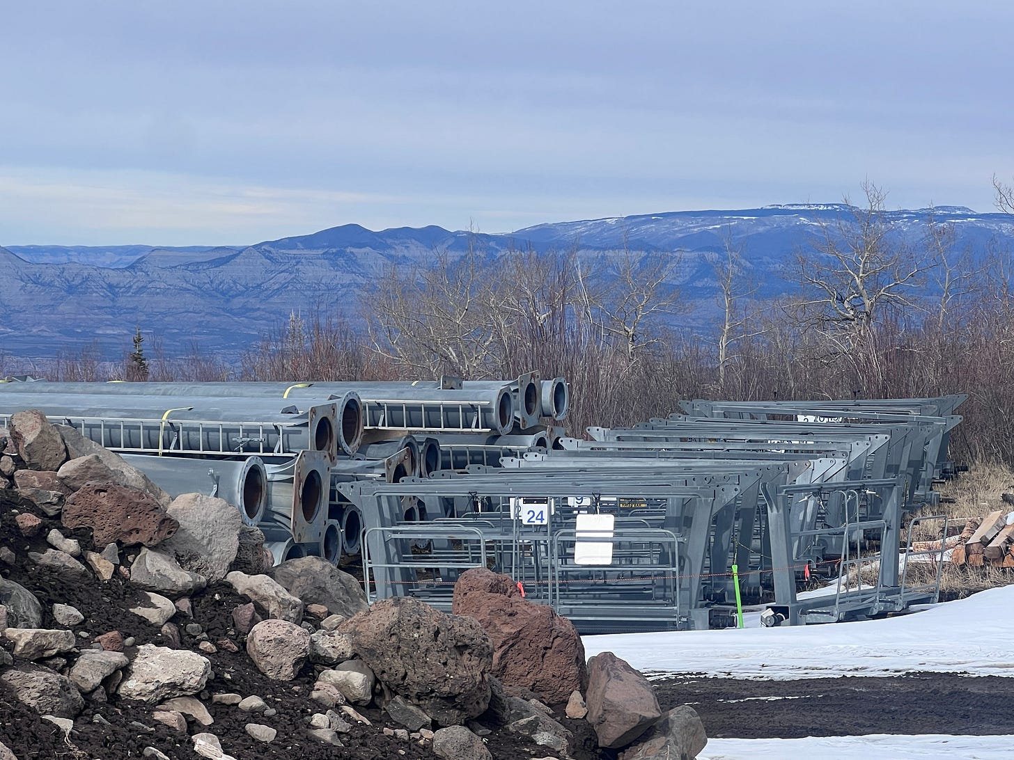 Parts of Snowmass’ old Elk Camp high-speed quad awaiting installation near the base of Powderhorn’s West End chairlift. Photo and video by Stuart Winchester.