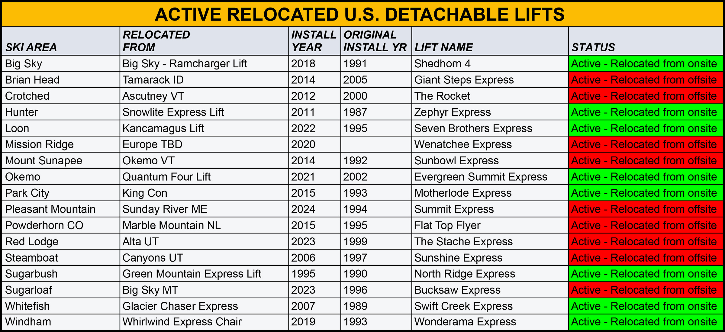 Given that the world’s first modern detachable chairlift debuted at Breckenridge 45 years ago, it’s astonishing how few have been relocated. Only 19 U.S. detaches that started life within the U.S. are now operating elsewhere in the country, and only nine moved to a different ski area: