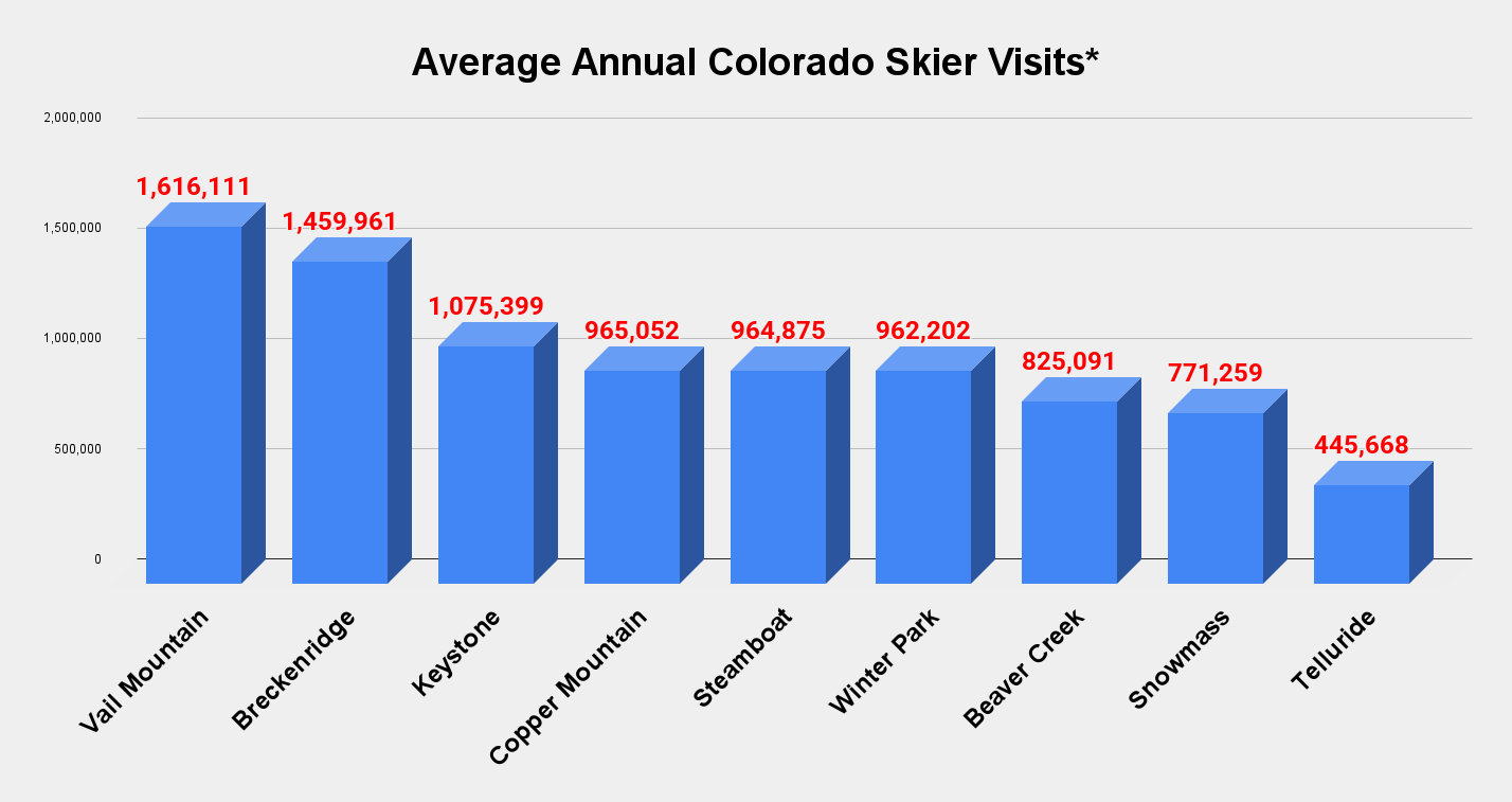 *Averages calculated using published past skier visit numbers, mostly between 2000 and 2010. Vail Resorts ceased to break out visits by resort around this time, and most of its competitors followed. If anyone wants to be a hero and anonymously leak me this info, that would be rad.