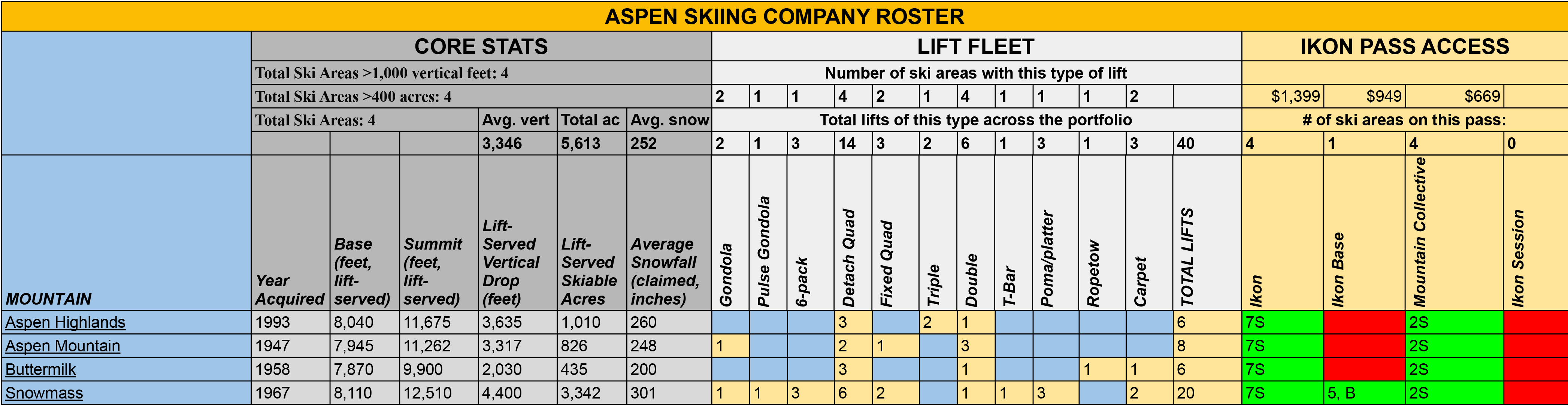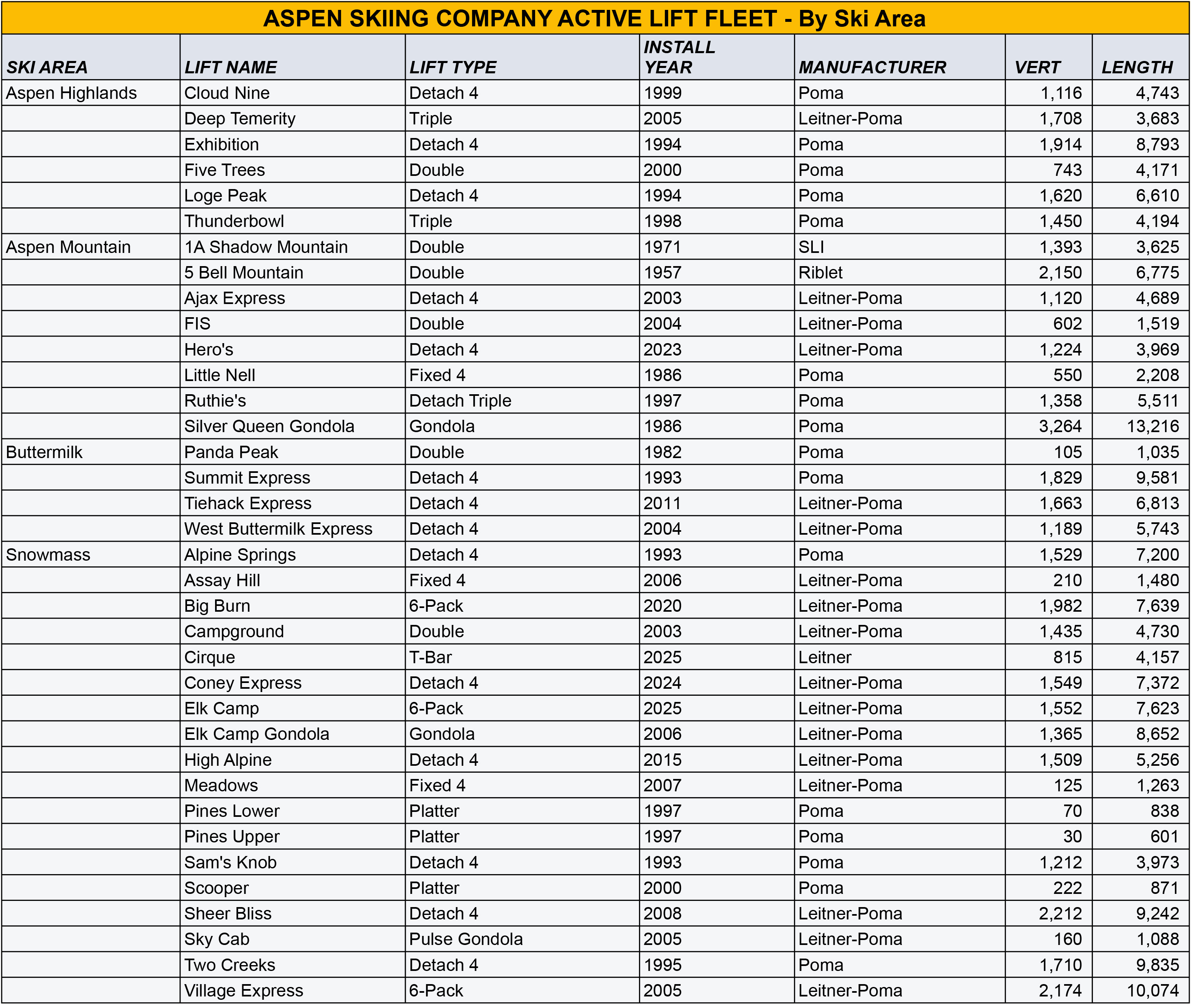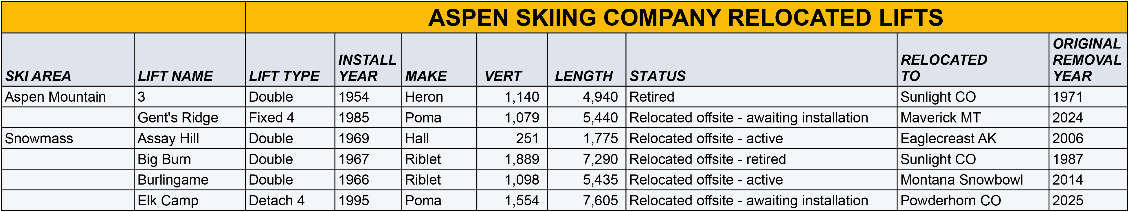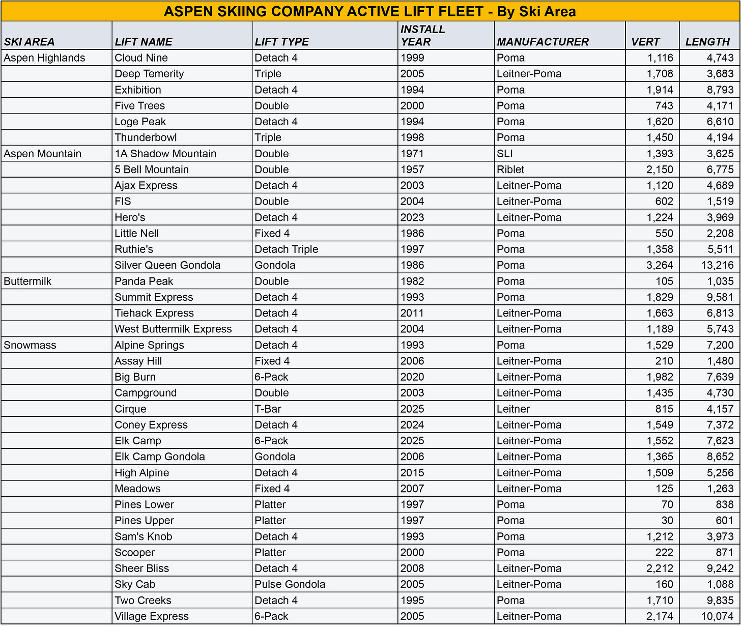 Data compiled from Lift Blog, legacy Aspen and Snowmass trailmaps on skimap.org, and other sources.