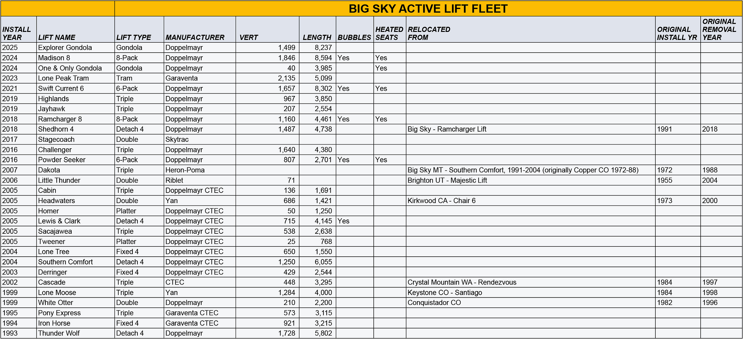 Snowmass’ recent lift upgrade splurges are impressive, but Big Sky has built an incredible 12 aerial lifts in the past decade, 11 of them brand-new. These are some of the most sophisticated lifts in the world and include two six-packs, two eight-packs, a tram, and two gondolas. This reverse chronology of Big Sky’s active lifts doubles as a neat history of the mountain’s evolution from striver importing other resorts’ leftovers to one of the top ski areas on the continent: