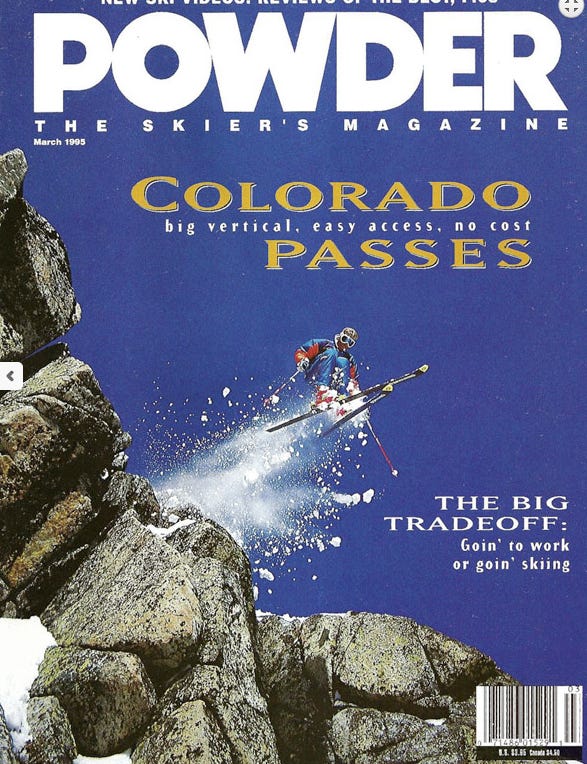 “THE SKIER’S MAGAZINE” it declared in all caps below the POWDER logo. “COLORADO PASSES – big vertical, easy access, no cost,” had been pasted above the flying skier. “THE BIG TRADEOFF: Goin’ to work or goin’ skiing,” was typed below.