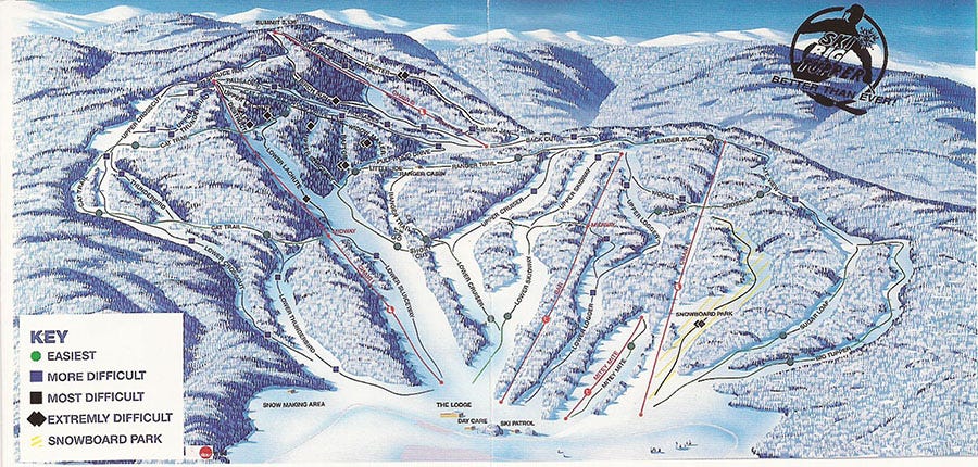 Yes, many of these were modest operations – Farmer Bob rigged up a ropetow using a tractor engine and a pair of deer antlers, and Snow Pole Ski Adventure Fun Park was born, where you could ski all day for a nickel. Three years later it was gone. But the state also has a substantial number of ghost areas where multiple lifts and sprawling trail networks sit abandoned: Bobcat, Cortina, Hickory, Scotch Valley, Tuxedo Ridge, Wing Hollow, and Highmount (slated to become part of Belleayre, maybe). Among the most substantial of these is Big Tupper. The 1997 trailmap:
