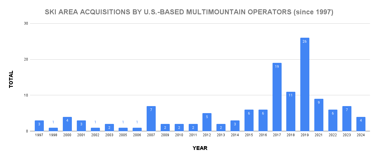 That’s a dramatic drop-off from the ski area bull market of 2017 to 2019, when multimountain operators ingested 56 ski areas. This was probably a singular time – Alterra was emerging from the carcass of Intrawest, and Vail went Death Star, swallowing 19-mountain Peak Resorts like a boa constrictor ingesting a tractor. But after the 2020 break to stabilize civilization, acquisitions ticked back up, with 22 more from 2021 to 2023.