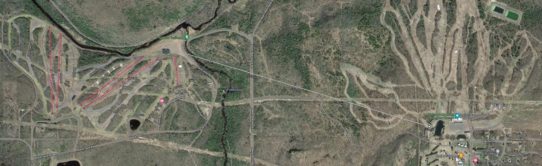 The most likely line, according to Fisher, would be from the bottom of Blackjack/Black River to the top of Indianhead/Jackson Creek. That’s a linear distance of 1.21 miles, according to Google Maps (Blackjack/Black River is on the left in this image; I drew a white line along the approximate line that Fisher suggests):