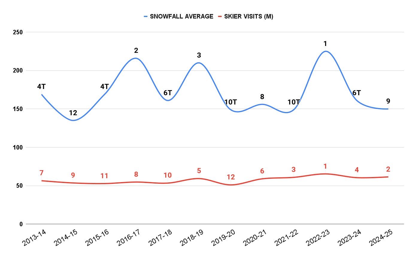 That 2024-25 drew the second most skier visits ever is a strong indicator that the industry’s decade-long reorientation from storm-dependent day tickets to preseason season pass sales has effectively decoupled a by-definition weather-dependent business from weather.