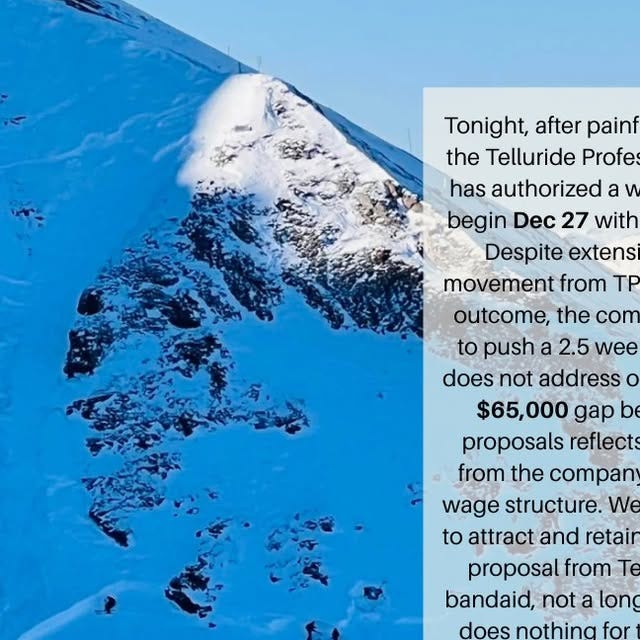 Telluride’s ski patrol, which organized in 2015 under United Mountain Workers (UMW), announced the strike earlier Wednesday, citing a “$65,000 gap between 3 year proposals” that “reflects unwillingness from the company to fix a broken wage structure.” Without citing specifics, the patrol’s public statements repeatedly cite a “broken wage structure” that has made it difficult to recruit and retain patrollers with the expertise needed to manage Telluride’s technical, treacherous terrain.