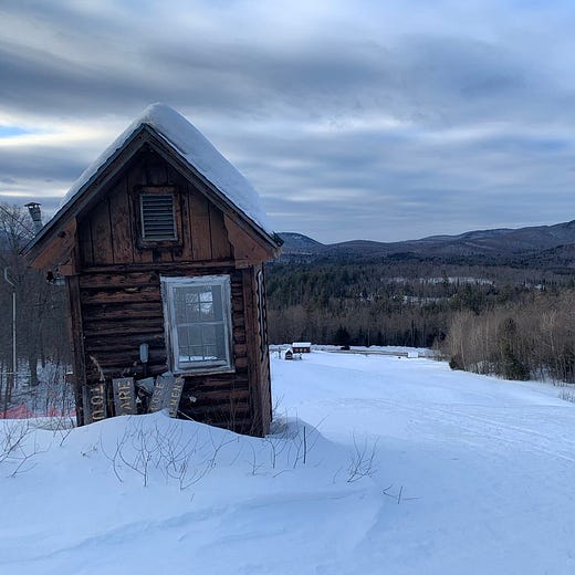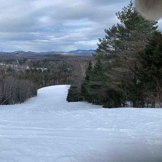 Swain sits on a long ridge with an assortment of quirky quad chairs tottering up the mountainside. The sun had been baking the series of straightline groomers beneath the lifts all morning and the temperature had risen above freezing and so I took several fast laps carving deep long arcs down the incline. There are eight or 10 of these runs bunched at the center of the ski area and then the shoulders at either end of the mountain hold clusters of twisty narrow runs ambling through the forest. The snow in these was garbage but the trails were so interesting and varied and mazelike that I kept venturing back in. The place was absolutely empty all day and at sundown the families materialized and the snow refroze and I got the hell out of there and drove six hours home.