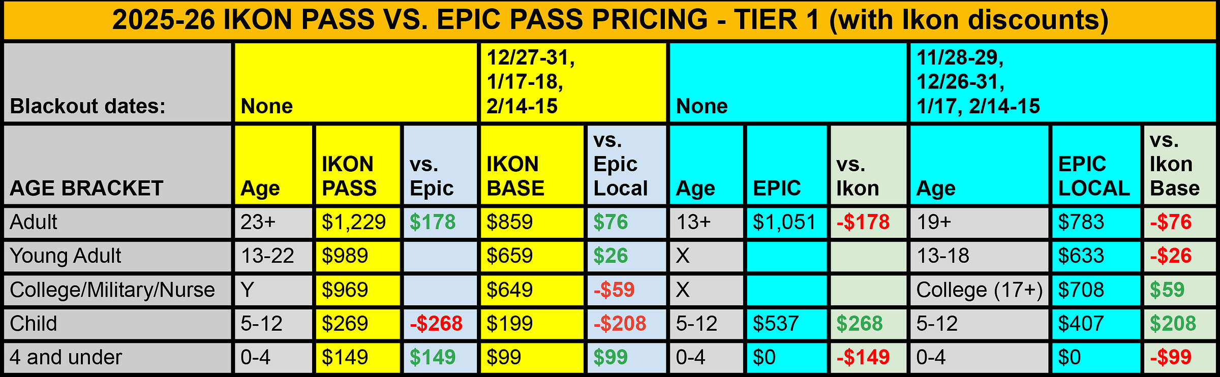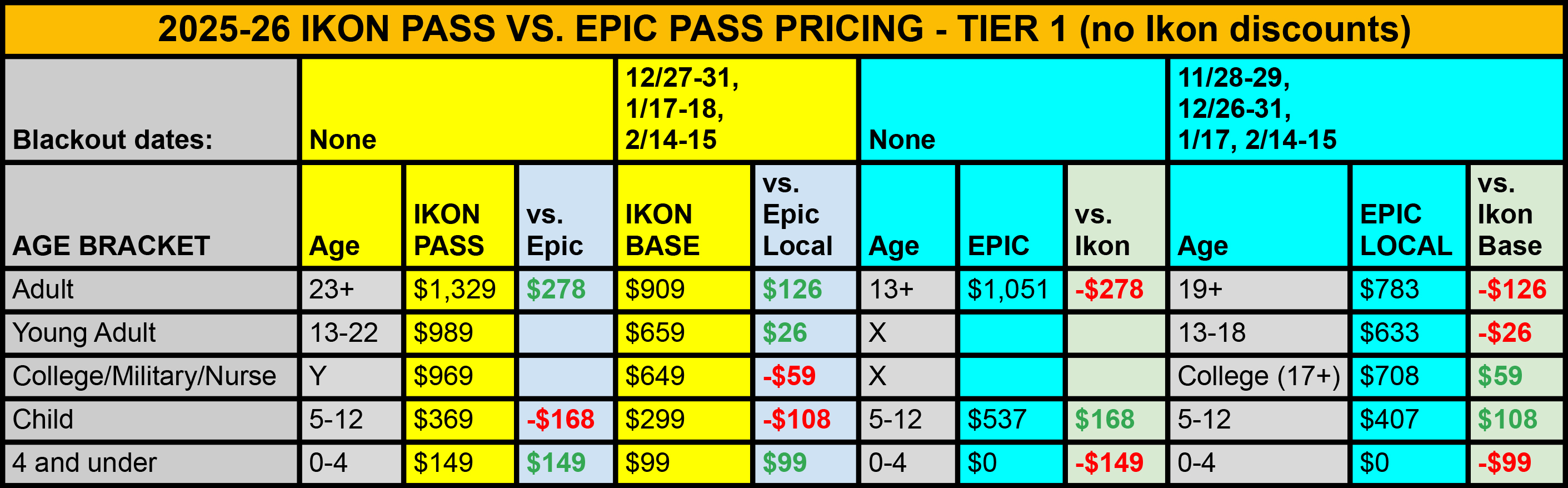 And here’s the difference across the main Epkon product suites if you consider Ikon renewal and child pass discounts: