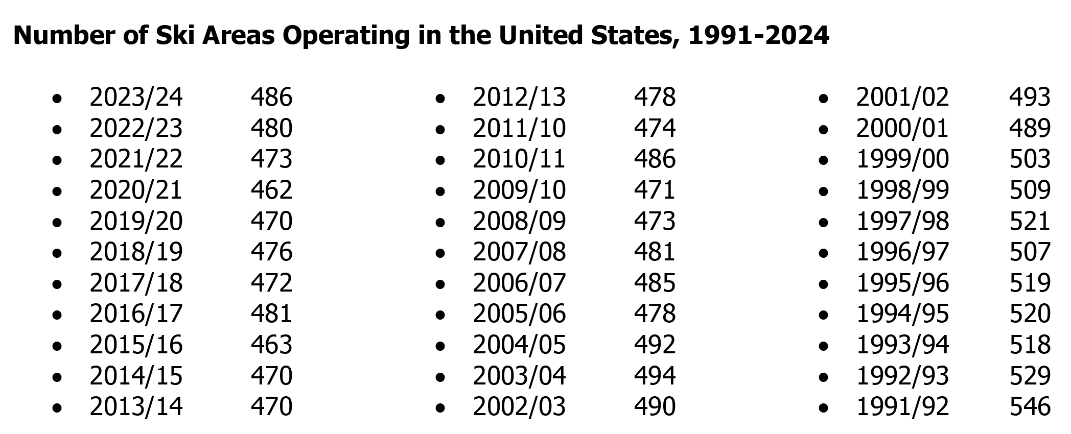 Right. I agree. The raw numbers of ski areas are accurate enough (though I keep a separate list and count 505 active ski areas for the 2024-25 ski season, nine more than the 496 I counted last year, which was 10 more than the NSAA’s 2023-24 count of 486; we’ll deal with that discrepancy in a future column). But let’s just say that approximately 10 percent fewer ski areas are operating in America this winter than in 1992. That’s bad, right?