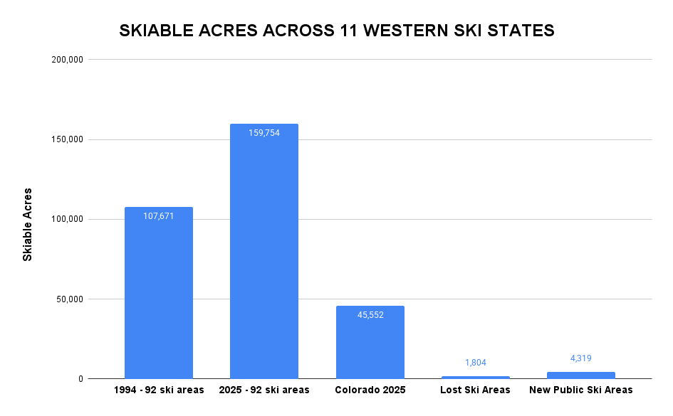 To add all that up: 52,083 acres of new terrain at existing mountains PLUS 4,319 acres at new public ski areas MINUS 1,804 acres worth of lost ski areas EQUALS 54,598 acres of new ski terrain in 11 western ski states since 1992.