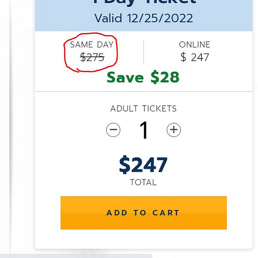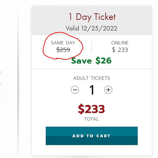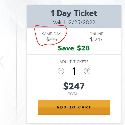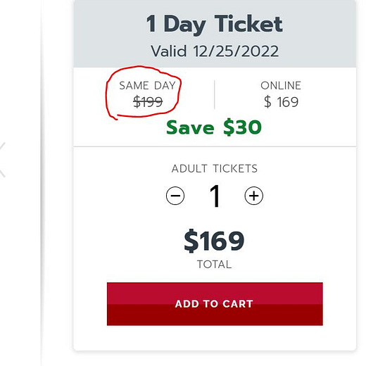 Looping back to Vail and Beaver Creek here – the peak ticket price jumped 15 percent in one season, from $239 to $275. It’s almost as though Vail wanted them to be the most expensive ski resorts in America. Why would they do that? Because that puts the mountains in the headlines, which gives them a chance to talk about what a bitchin’ deal the Epic Day Pass is, which is what happens when you attempt to purchase a peak-day lift ticket:
