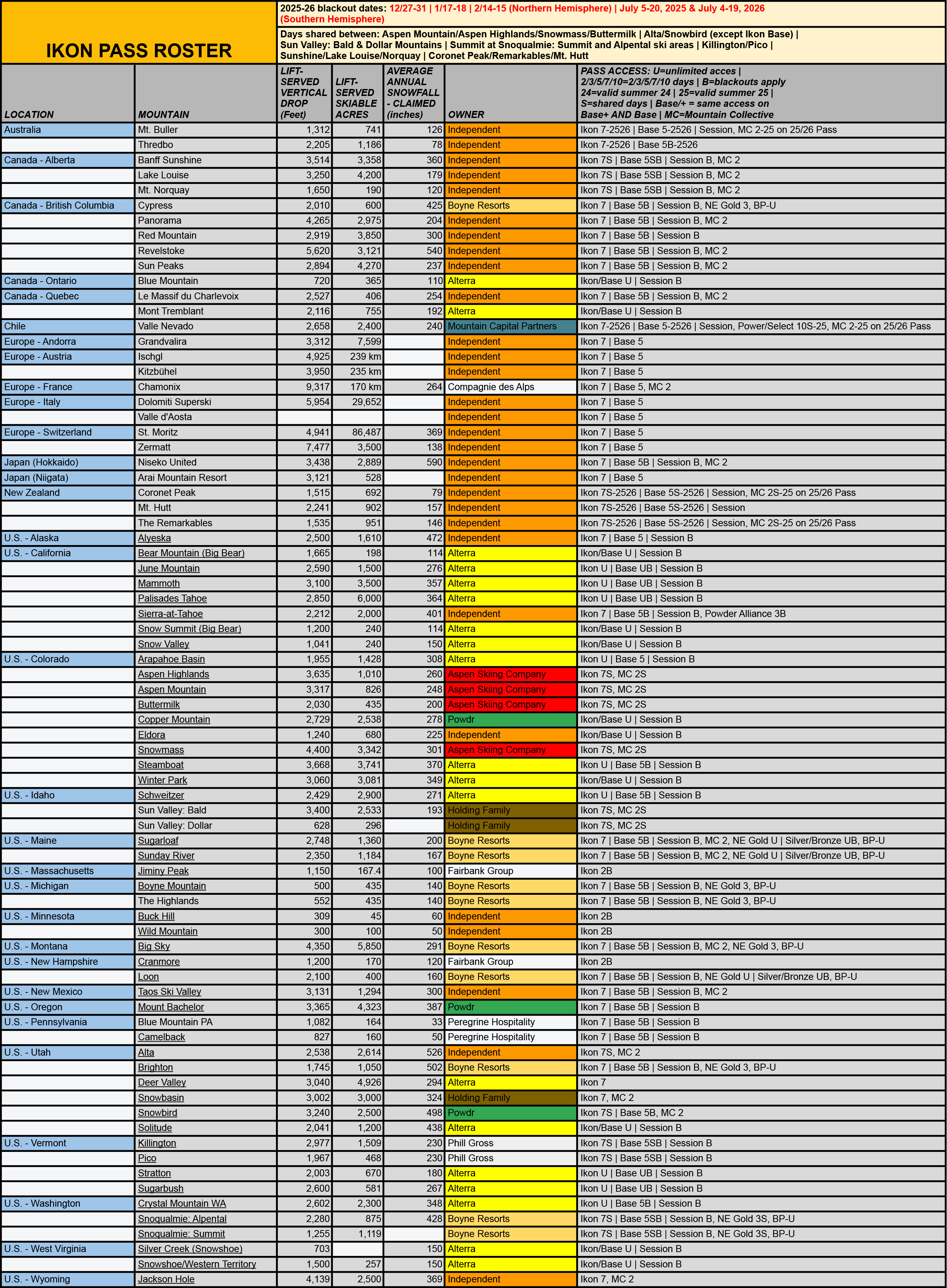 Valle d’Aosta is Ikon’s second destination in Italy, joining Dolomiti Superski and its dozen-ish ski areas. Passholders can now access eight destinations across Europe and more than a dozen outside of North America. Here’s Ikon’s 2025-26 roster, which returns every partner from previous seasons save Windham, New York: