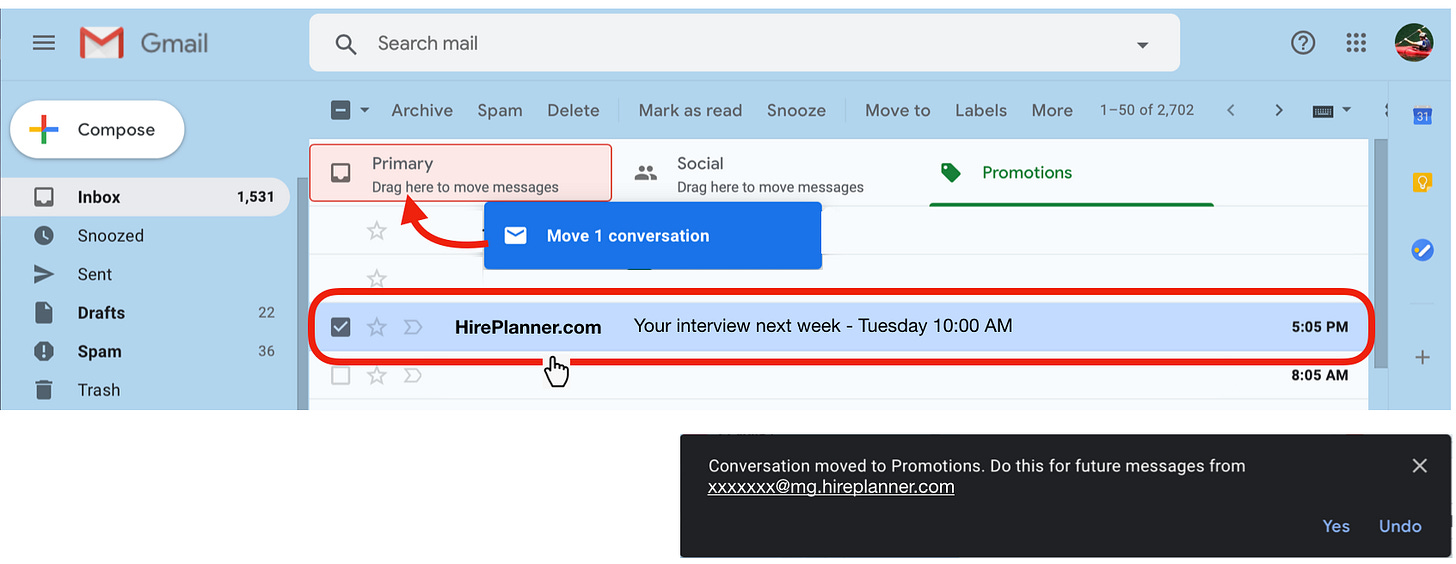 So one of the big issues with Gmail is that The Storm Skiing Journal emails drop directly into the promo box alongside the emails from CVS that you haven’t opened in nine years. To put this right, just drag-and-drop your next two or three Storm Skiing Journal emails from the Promotions folder to the Primary folder, as so: